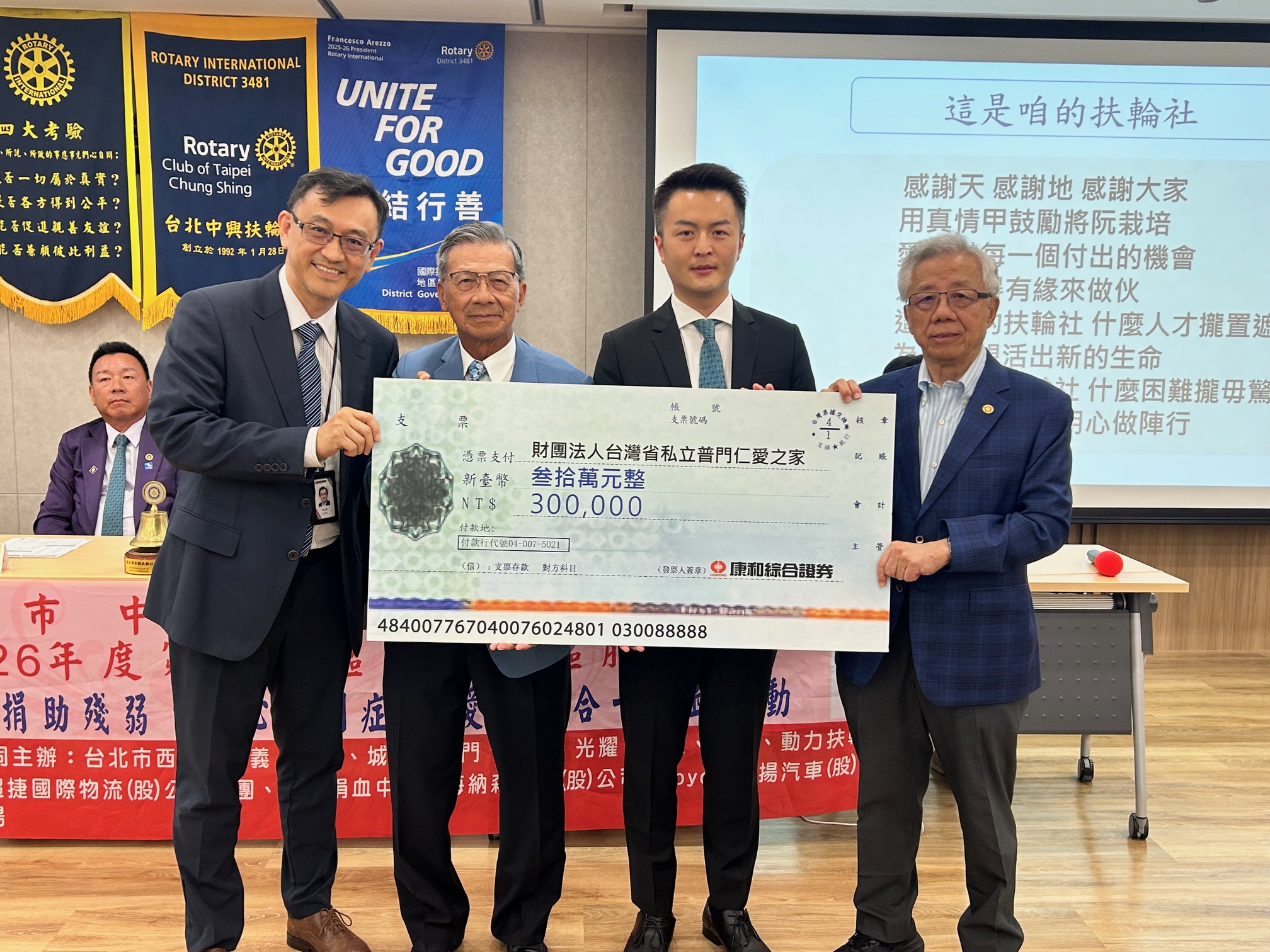 由台南普門仁愛之家董事郭達隆(左二)代表接受。