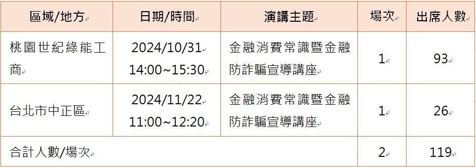 金融詐騙案件層出不窮,特別是銀髮族與弱勢長輩,由於對金融產品及詐騙手法的認知不足,往往成為詐騙集團的首要目標。為了提升此族群對金融消費的正確觀念及防範詐騙能力,本公司規劃結合實際案例與互動問答的方式,讓參與者在輕鬆的氛圍中獲取重要的金融知識,進一步守護財務安全,共舉辦1場,合計人數26人參加。