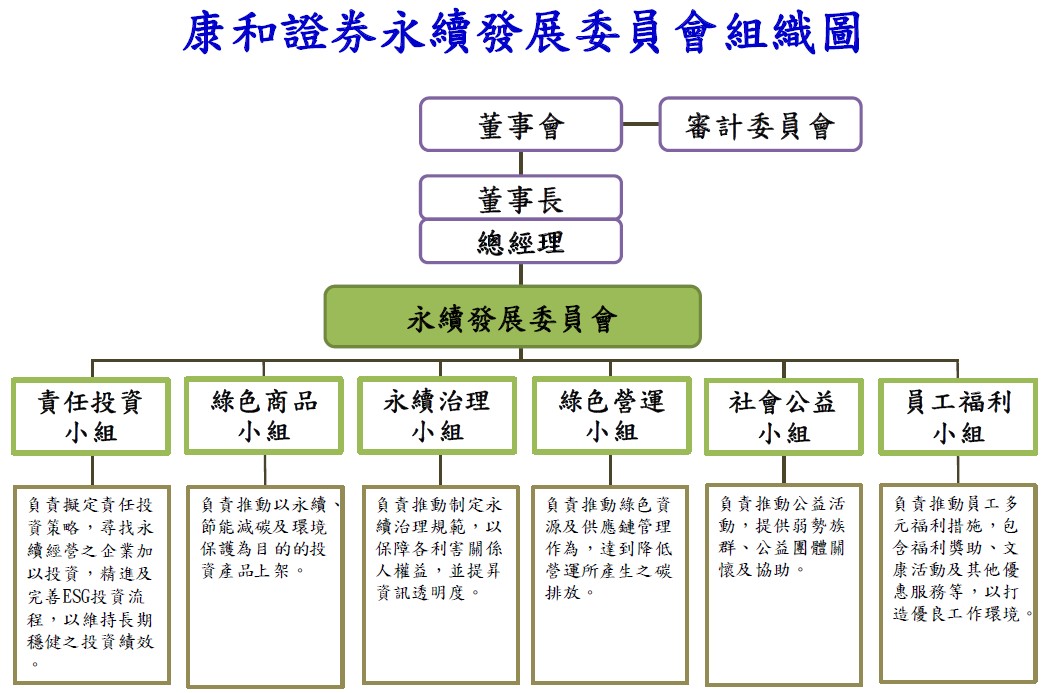 為落實企業永續發展願景,訂定永續發展實務守則做為公司實踐永續發展之依循,並於2022年3月成立「永續發展委員會」,由董事長擔任主任委員,由總經理擔任副主任委員,各小組召集人為當然委員,下設任務編制小組,包括「責任投資小組」、「綠色商品小組」、「永續治理小組」、「綠色營運小組」、「社會公益小組」、「員工福利小組」等每年至少召開一次,必要時得隨時召開臨時會議。「永續發展委員會」由上而下計畫執行永續發展年度計畫及專案之成效追蹤與檢討,落實ESG年度目標。