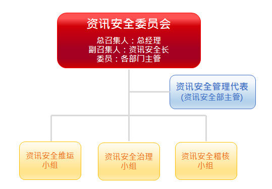 此外,本公司设有「资讯安全委员会」,由总经理担任总召集人、资讯安全长担任副召集人,委员由本公司总经理及各部门主管担任,负责审核资讯安全管理系统目标及实施范围;资讯安全部主管担任资讯安全管理代表,负责督导资讯安全管理系统之实施及协调各组作业。