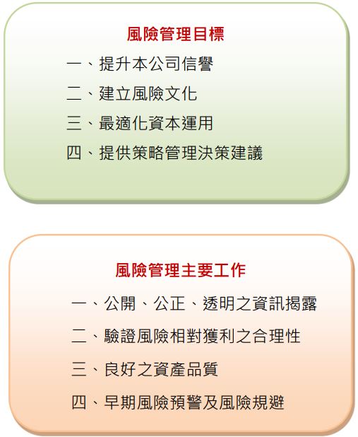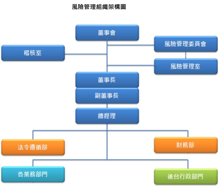 - 董事会:本公司董事会为公司风险管理之最高单位,以遵循法令、推动并落实公司整体风险管理为目标,明确了解证券商营运所面临之风险,确保风险管理之有效性,并负风险管理最终责任。