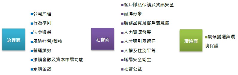 将永续价值融入日常营运与业务发展,为社会或环境带来永续效益,成就永续金融的愿景。提供客户多元金融服务并与其一同关注永续议题,整合ESG精神至业务流程及策略中,引导及鼓励客户重视绿色环保及社会议题。
