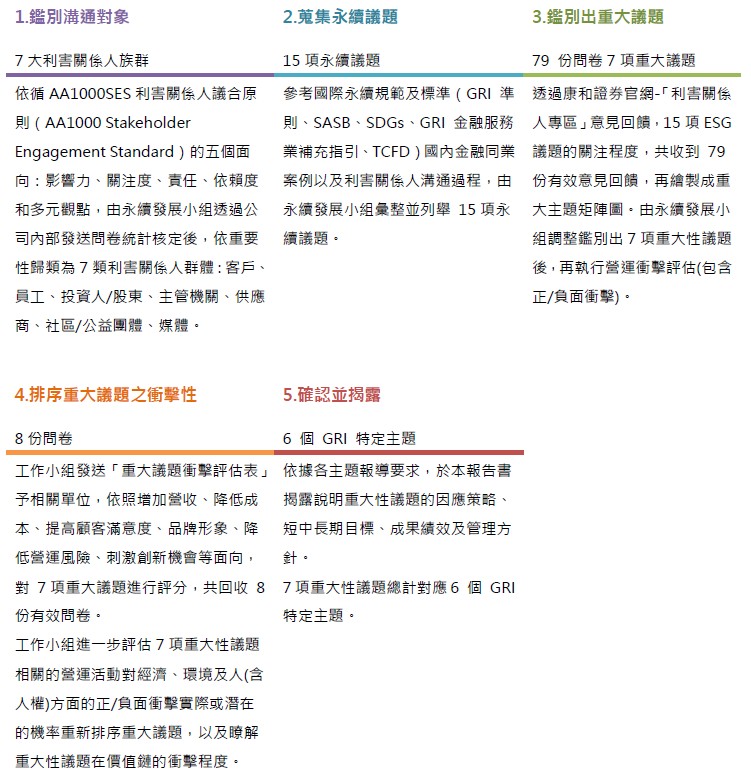 康和证券参考GRI准则与AA 1000当责性原则标准,以包容性、重大性、回应性、冲击性四大原则,辨识重大性议题,并依循GRI通用准则2021版,评估重大性议题在经济、环境、人(含人权)方面冲击的显著性,作为永续发展策略规划的依据。