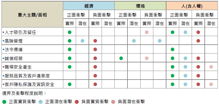 永续发展委员会工作小组评估7项重大性议题对经济、环境及人(含人权)面向产生的影响,就实际潜在、正向负向的冲击程度及发生实际或潜在的机率进行评估汇整重大性依冲击程度排序结果如下: