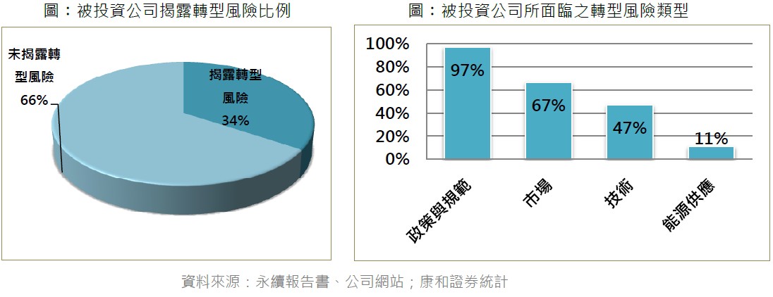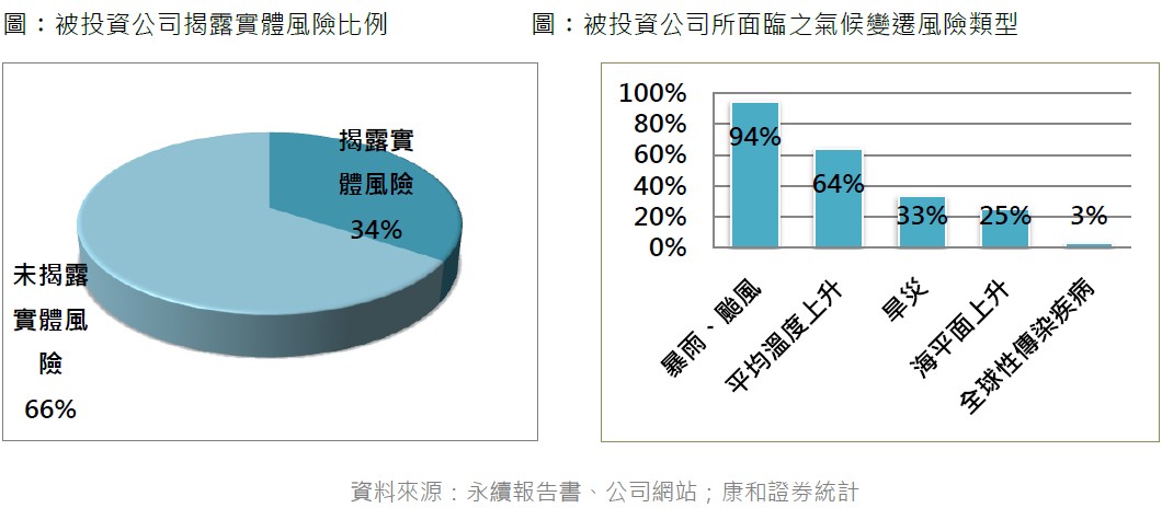 康和重视被投资公司面对全球气候变迁的实体与转型风险,遵循责任投资之气候风险揭露与准则。责任投资交易目的为中长期投资,主要投资范围涵盖碳中和观点、能源政策、工业脱碳...等ESG趋势,于投资流程中考量被投资公司之ESG风险与绩效,透过持续关注被投资公司、出席股东会、行使投票权、建设性对话等作为,促进被投资公司永续发展,透过责任投资议合鼓励客户制定净零方案并加速永续转型,投资部位之风险控管依循公司制定之风险管理机制执行。