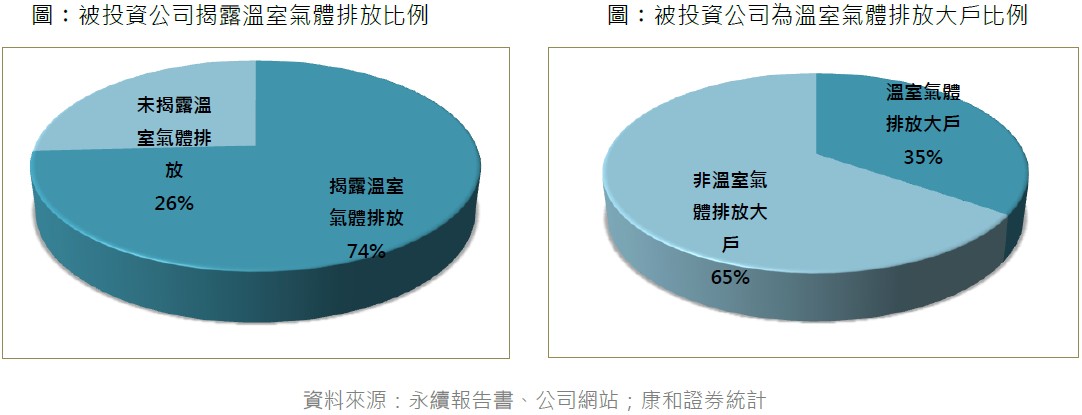 (1)105家被投资公司中已「揭露温室气体排放」资讯(以范畴一 和范畴二为主)占74%,而26%被投资公司尚未揭露温室气体排放资讯。